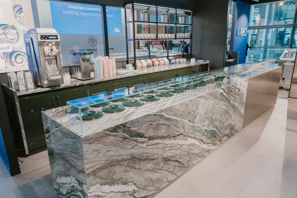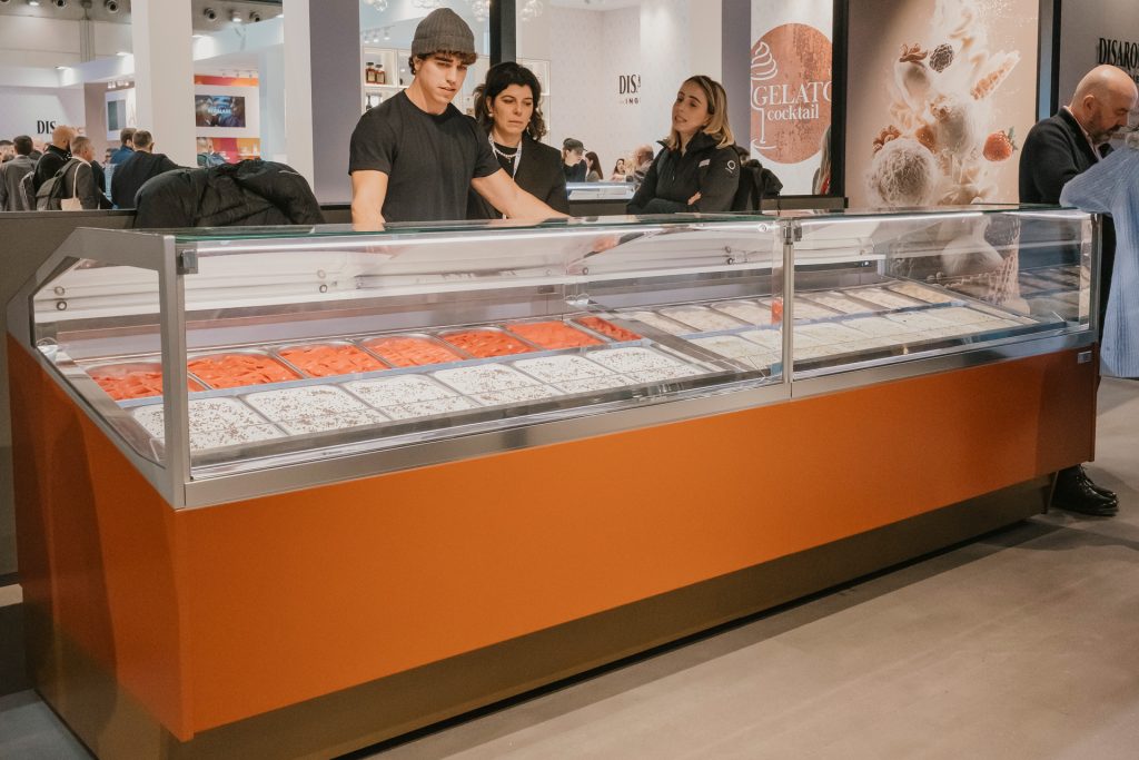 Particular attention was also paid to MultyCool pozzetti counters. Maestro Bruschi showed how this technology overcomes the limitations of traditional display cases: thanks to differentiated temperature management, it is possible to display and serve products with different temperature requirements at the same time – from soft-serve ice cream to granitas and frozen pastries – all within the same unit. This versatility transforms the counter into a multifunctional sales tool.
