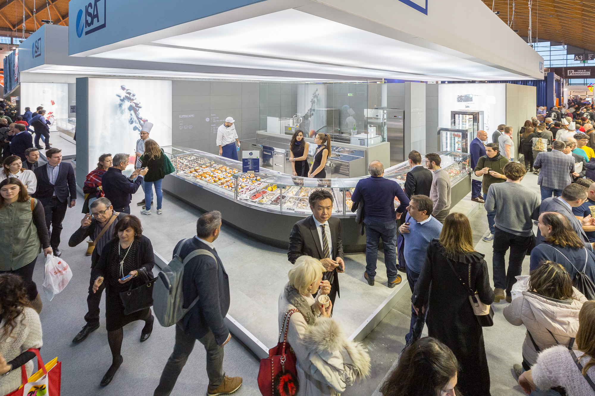 Il maestro gelatiere Alessandro Racca, nonché esponente affermato della pasticceria italiana, ha impreziosito con le sue creazioni una parte dello stand ISA, arredato da una composizione di vetrine professionali Supercapri canalizzate ad angolo. La parte posteriore riproduceva invece un vero e proprio laboratorio funzionante dove quotidianamente veniva prodotto il gelato dal gelatiere Davide Bruno di Mo.ca.